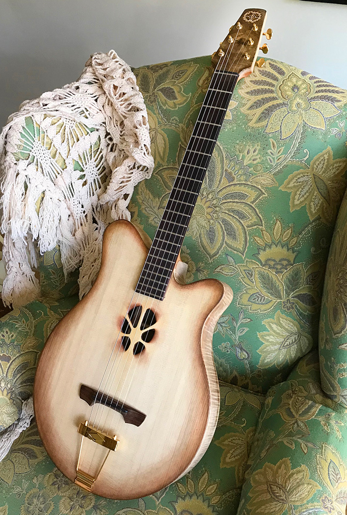Creature is a light-weight, responsive yet robust instrument with the playability of an electric guitar and a full acoustic tone. Its smaller, pierced soundhole emphasizes a punchy, speaker-like tone. Its low-end projection is surprising given its thin-line body construction.